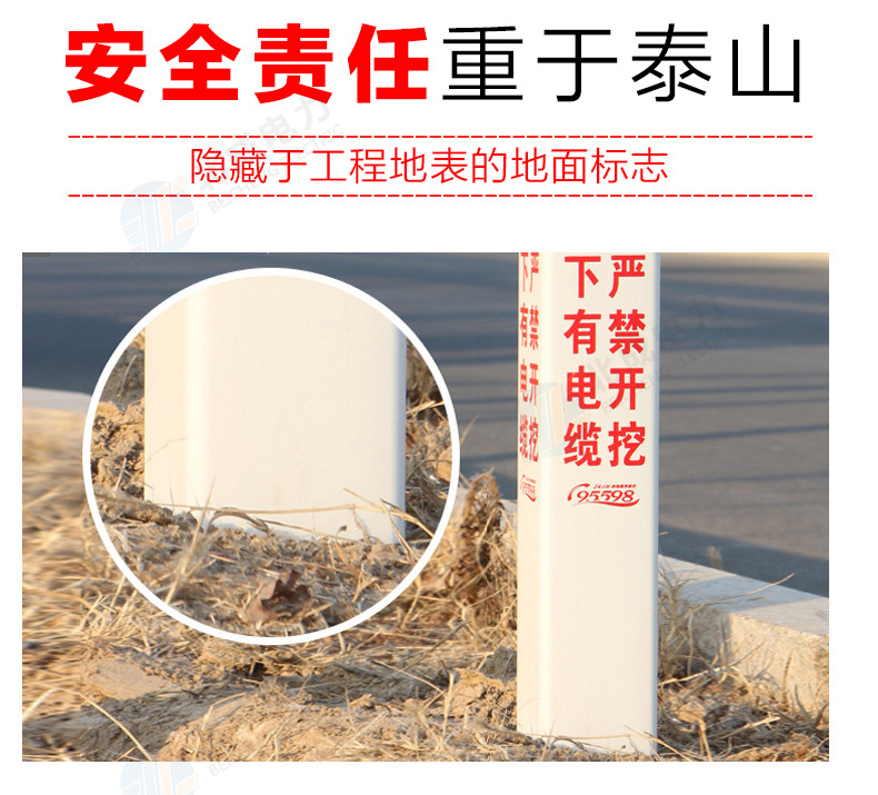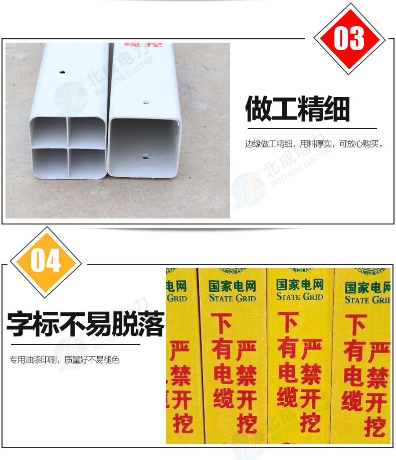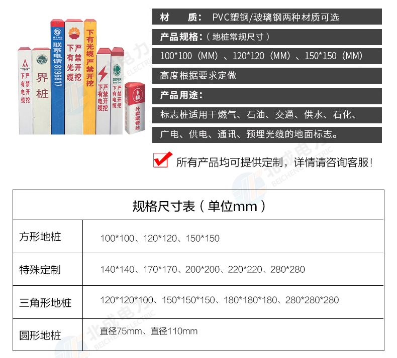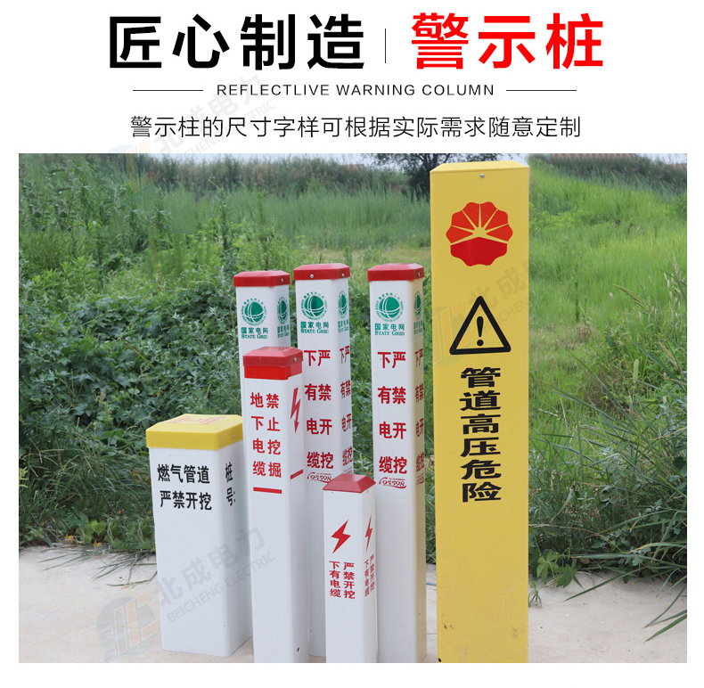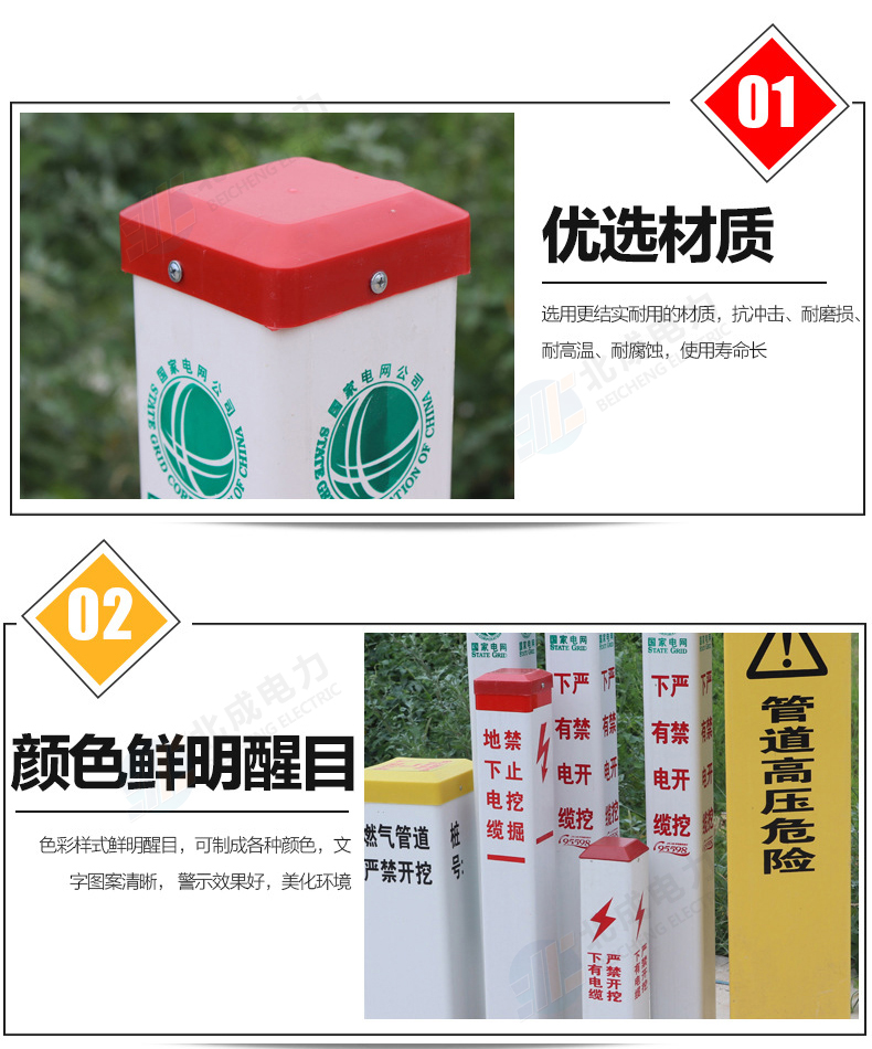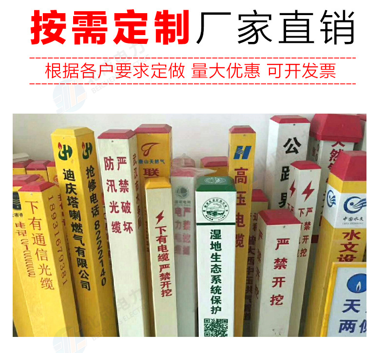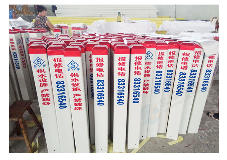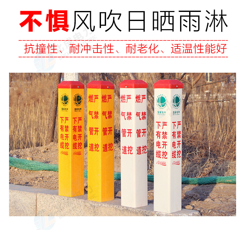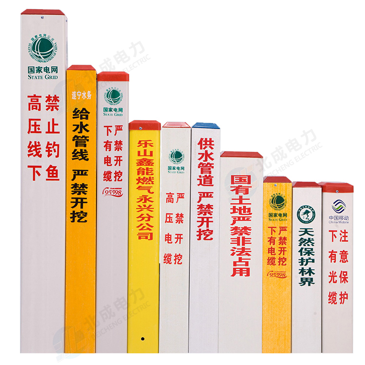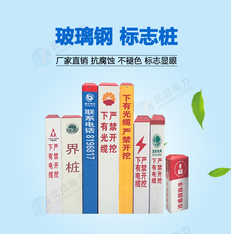 標志樁按用途分為: 電纜標志樁、油氣標志樁、通信標志樁、光纜標志樁、自來水標志樁、鐵路標志樁、公路里程樁。 性能指標: 1、拉伸強度≥160MPa 2、彎曲強度≥190MPa 3、浸水后彎曲強度≥150MPa 4、巴氏硬度≥38 5、環(huán)鋼度(5%)≥50KPa 6、熱變形溫度≥160℃ 7、氧指數(shù)26% 石家莊北成電力科技有限公司 聯(lián)系電話: 17603245663(微信同號) / 0311-67593878